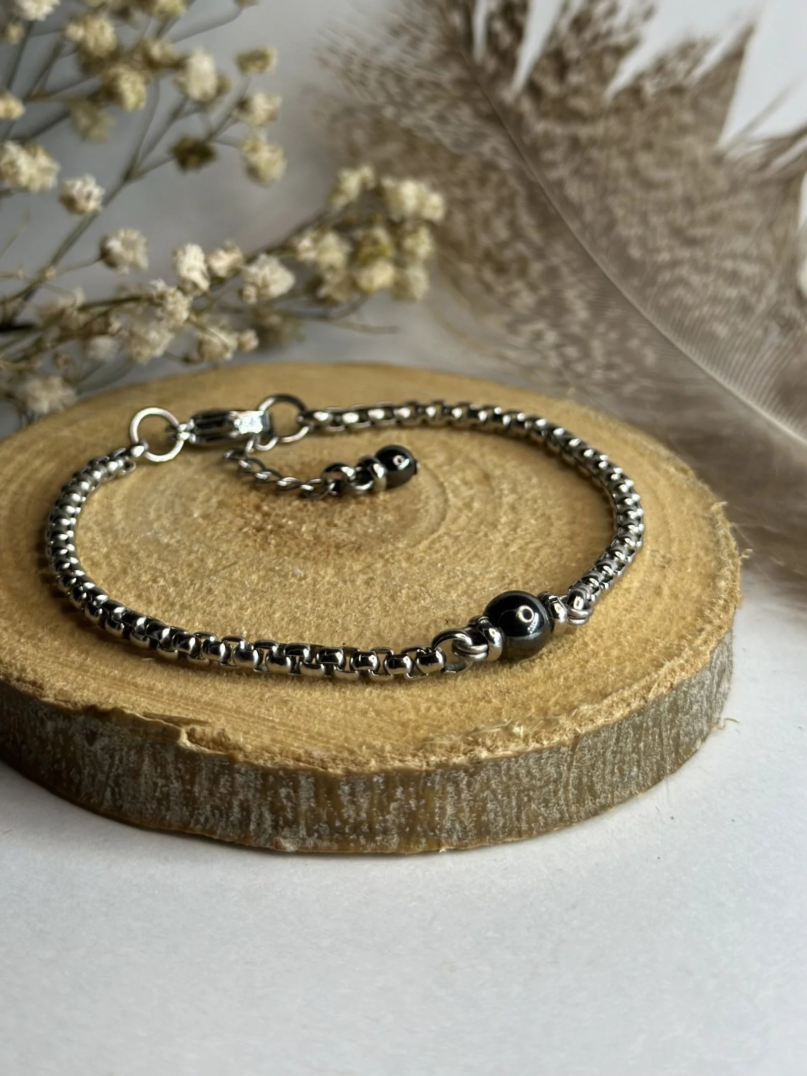 Pulseira em aço com esfera de Hematite